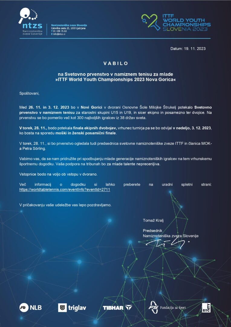 Le še dober dan nas loči od še enega zahtevnega organizacijskega projekta, ki ga s svojo ekipo zunanjih sodelavcev pripravlja NTZS. Po treh turnirjih, ki so že za nami, nas od zadnje novembrske nedelje do prve v decembru prvič pri nas čaka še mladinsko svetovno prvenstvo v namiznem tenisu, kjer se bodo predstavili le najboljši s celega sveta v mladinski (19 let) in kadetski (15 let) kategoriji. Za uvod bomo v Novi Gorici videli ekipne boje. (več …) …